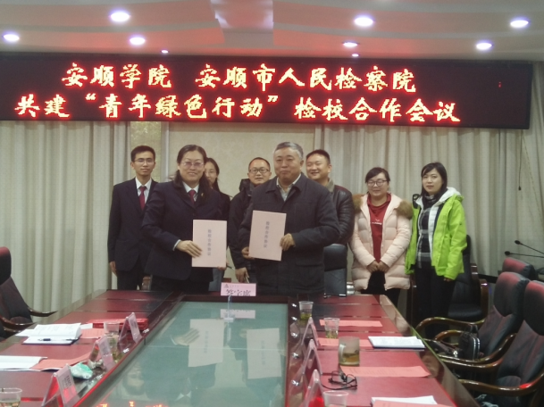 12?8日下午,安顺学院与安顺市人民检察院共建“青年绿色行动”检校合作会议及合作协议签订仪式在安顺学院会议室举行。安顺市人民检察院党组成员、副检察长曾晓红,生态环保检察处处长罗蒙等,安顺学院党委委员、副校长令狐荣涛教授、团委书记杨文波、相关工作人员及我校资源与环境工程学院师生代表出席会议。会议由团委书记杨文波主持?/p>