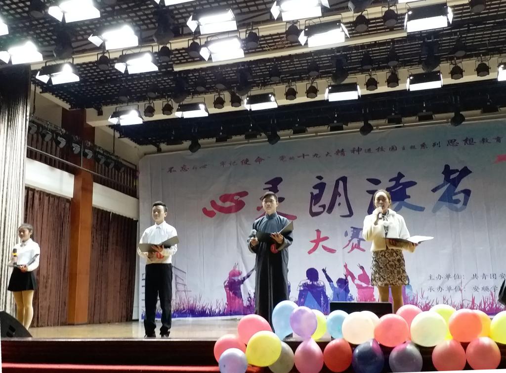 寒冬料峭、书声朗朗?2?3日下午,由共青团安顺学院委员会主办,安顺学院大学生联合会承办?017年安顺学院“心性文?middot;塑造靓丽青春”青年马克思主义学习研究主题心灵朗读大赛在大礼堂举行。安顺学院副院长令狐荣涛致辞。校党政办主任韦英、党委宣传部部长蔡少平、工会主席史贤琴、国资处副处长李建华、校团委副书记胡蕾担任比赛评委?/p>